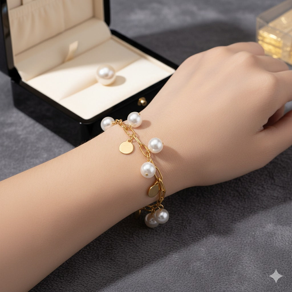 This gold chain bracelet with pearls and disc charms adds timeless charm to any outfit. The harmonious blend of gold and pearls brings both elegance and a touch of playfulness. Whether you wear it alone or stack it with other favorites, it’s perfect for those who appreciate dainty, meaningful jewelry with modern flair.