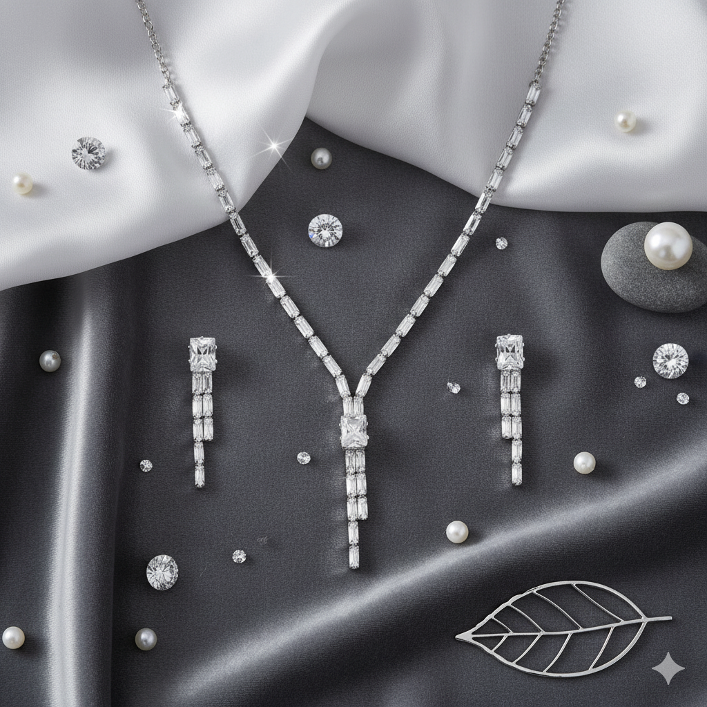 This set combines luxury and versatility, making it ideal for formal occasions, bridal wear, or gifting. The high-quality CZ stones and silver-plated finish provide a refined look that complements any ensemble.